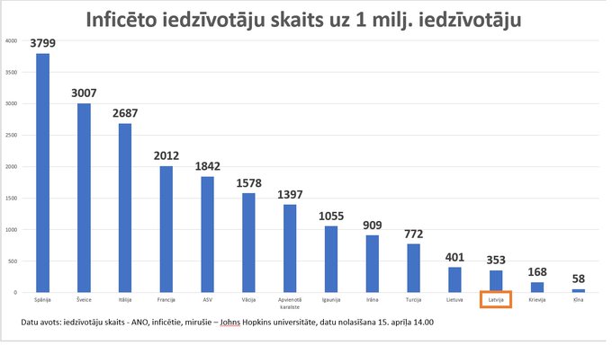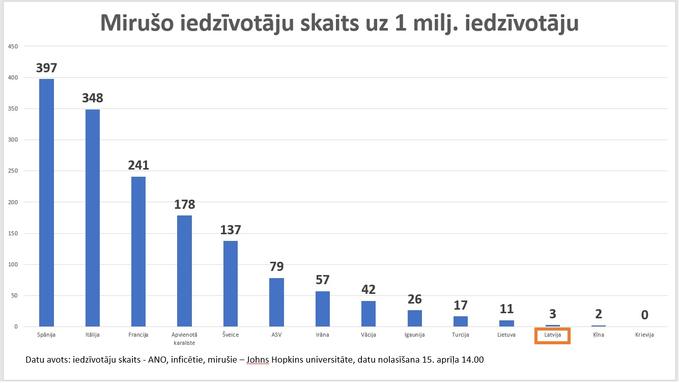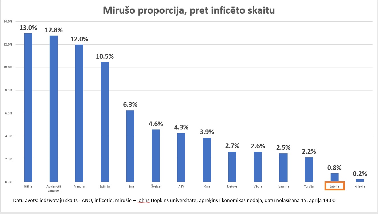 “Tālāk – kāda ir mirušo proporcija pret inficēto skaitu. Ļoti augsts procents vidēji ir ap 4%. Itālijā ir 13%, Apvienotajā Karalistē – 13%, Francijā – 12%, Spānijā -11%, Irāna – 6%, Šveice – 5% un ASV ir 4 %. Ja tajos 4% iekļaujas, tad to var uzskatīt par statistiski pieņemamu, bet ne cilvēciski pieņemamu,” rezumēja politiķis.