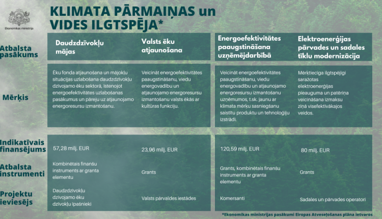 - Daudzdzīvokļu māju energoefektivitātes uzlabošanai un pārejai uz atjaunojamo energoresursu izmantošanu daudzdzīvokļu dzīvojamo ēku dzīvokļu īpašniekiem būs pieejams kombinētais finanšu instruments ar granta elementu kopumā 57,28 milj. eiro apmērā;